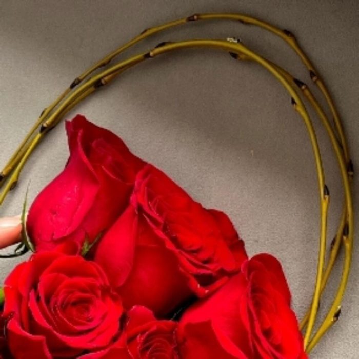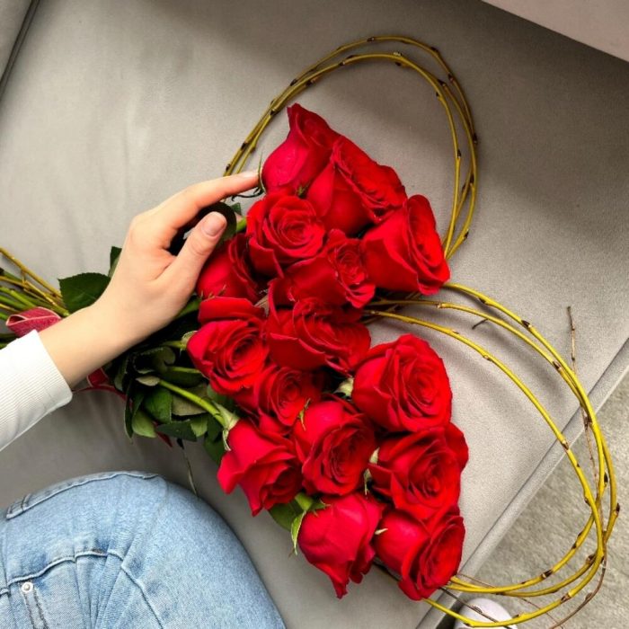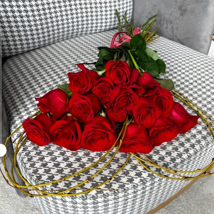 Лента – 1 шт. Роза красная – 15 шт. ветки декоративные – 6 шт.