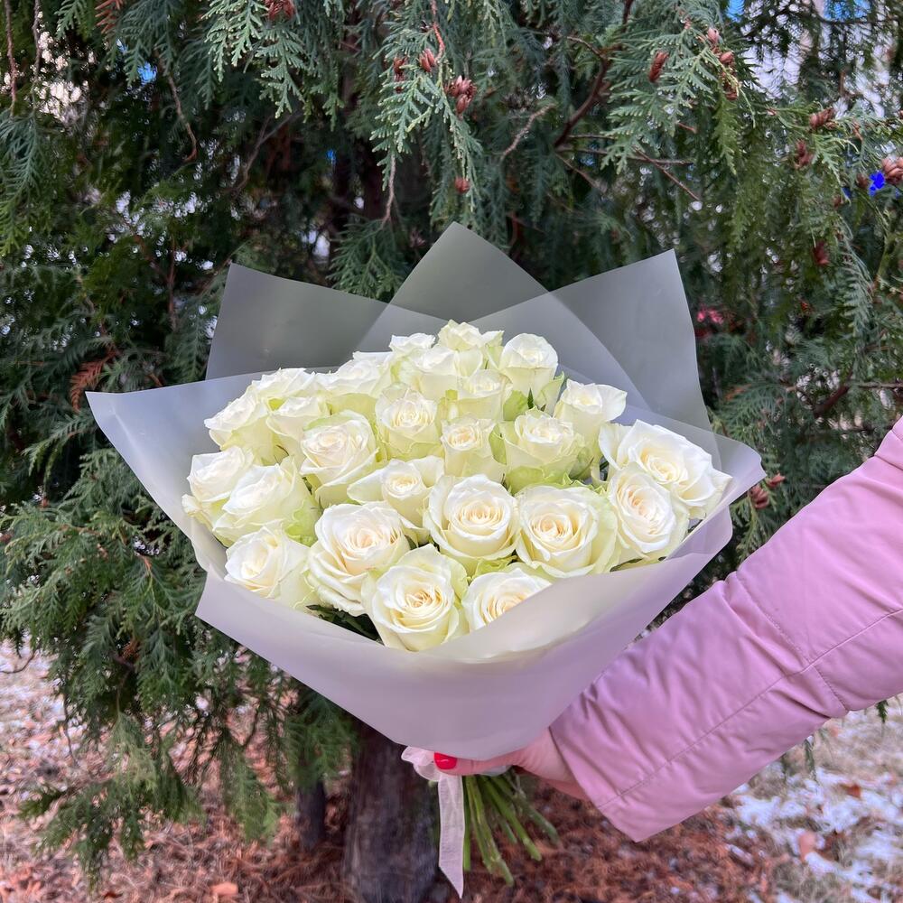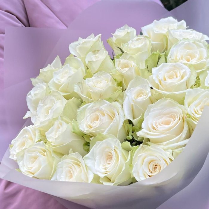 Лента атласная – 1 шт.Роза белая – 25 шт.Пленка матовая – 1 шт.