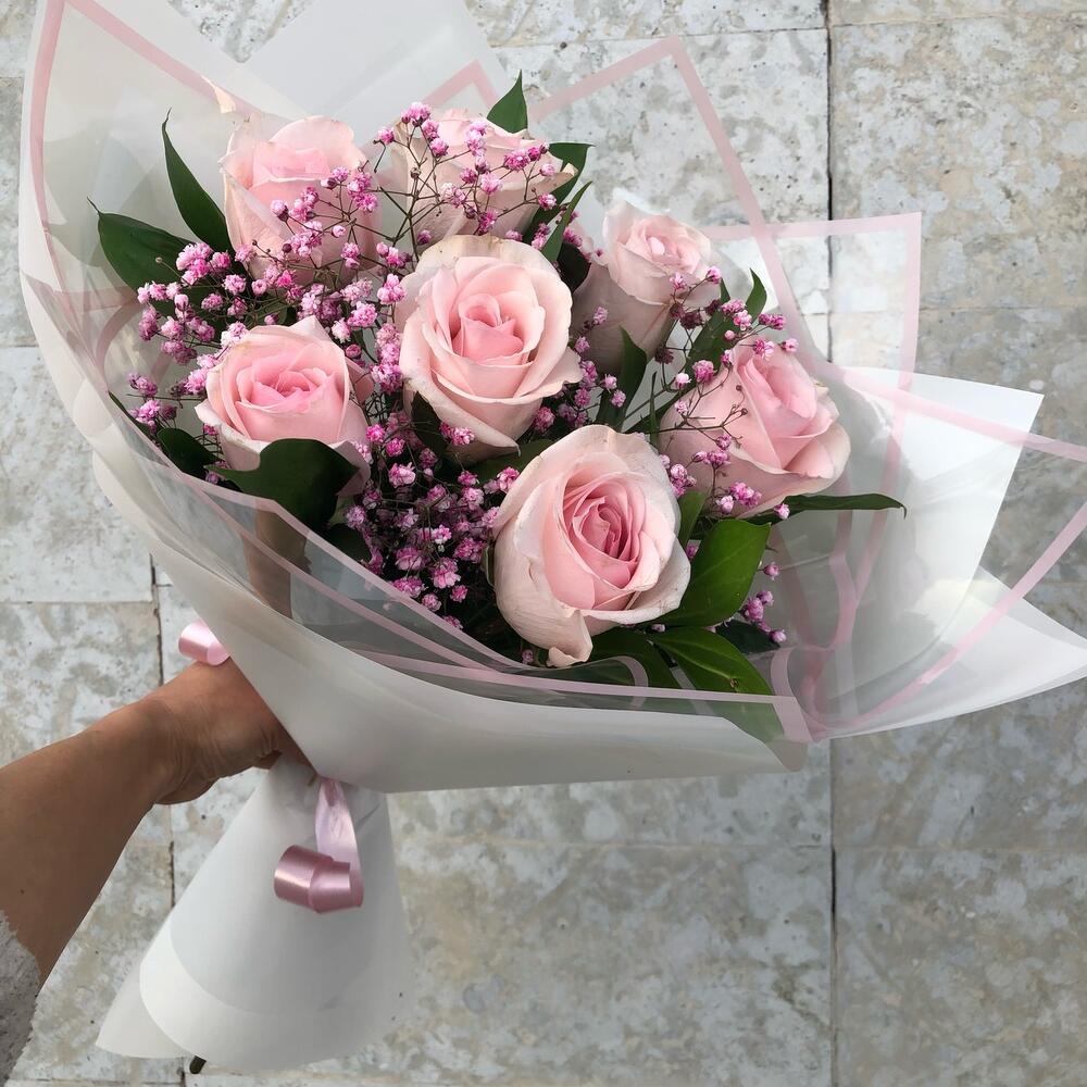 Букет из 7 роз с гипсофилой