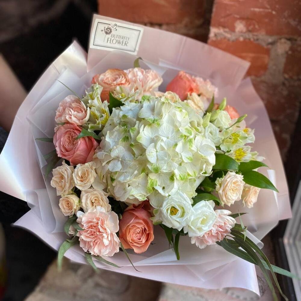 Букет из гортензии, пионовидной розы, эустомы, диантуса, кустовой розы и альстромерии “Летняя нежность”