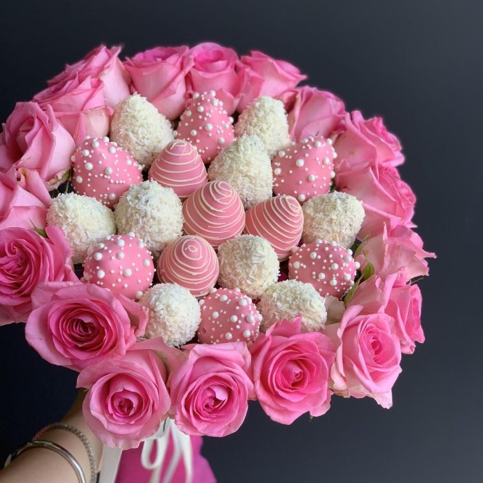 Клубника в шоколаде – 19 шт.Роза розовая – 19 шт.бумага упаковочная – 1 шт.Лента атласная – 1 шт.Открытка – 1 шт.