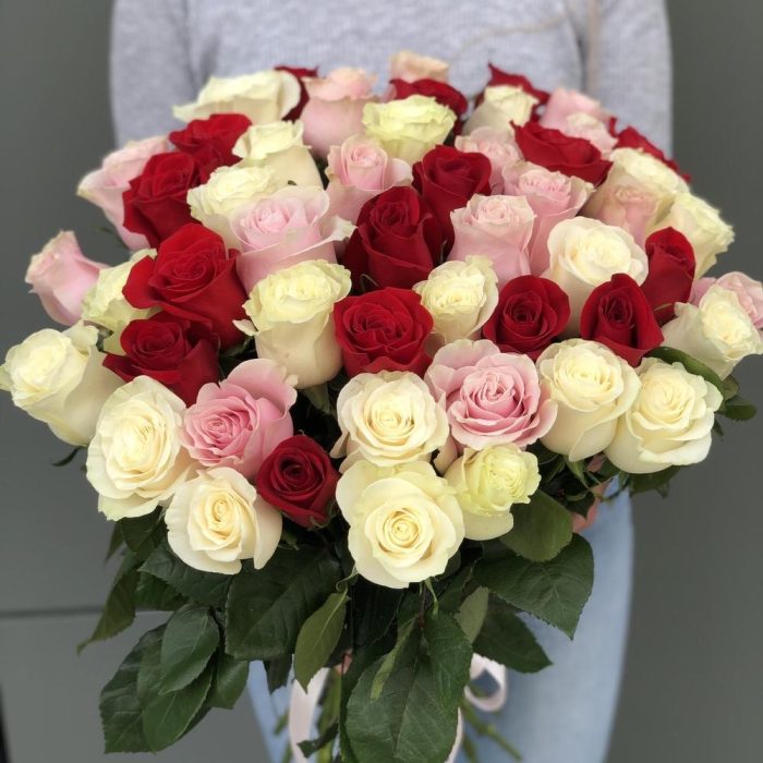 Букет из красных, белых и розовых роз Бабочки внутри меня из 51 розы