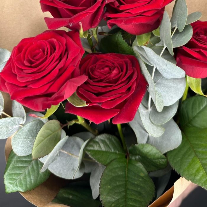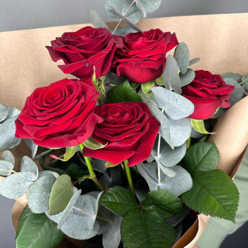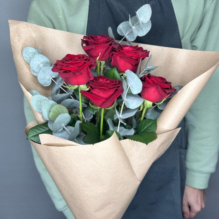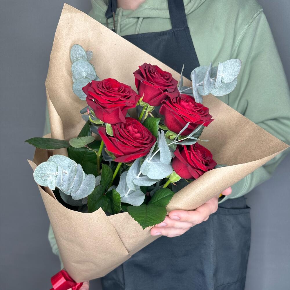 Лента атласная – 1 шт.Упаковка дизайнерская – 1 шт.Роза одноголовая россия – 5 шт.