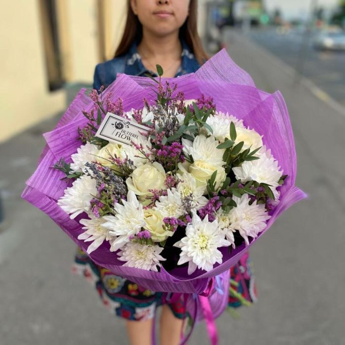 Лаванда – 20 шт.Хризантема кустовая – 6 шт.Роза – 7 шт.Лимониум – 3 шт.Эвкалипт – 2 шт.Статица – 2 шт.Упаковка – 2 шт.