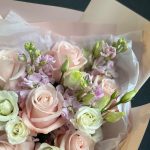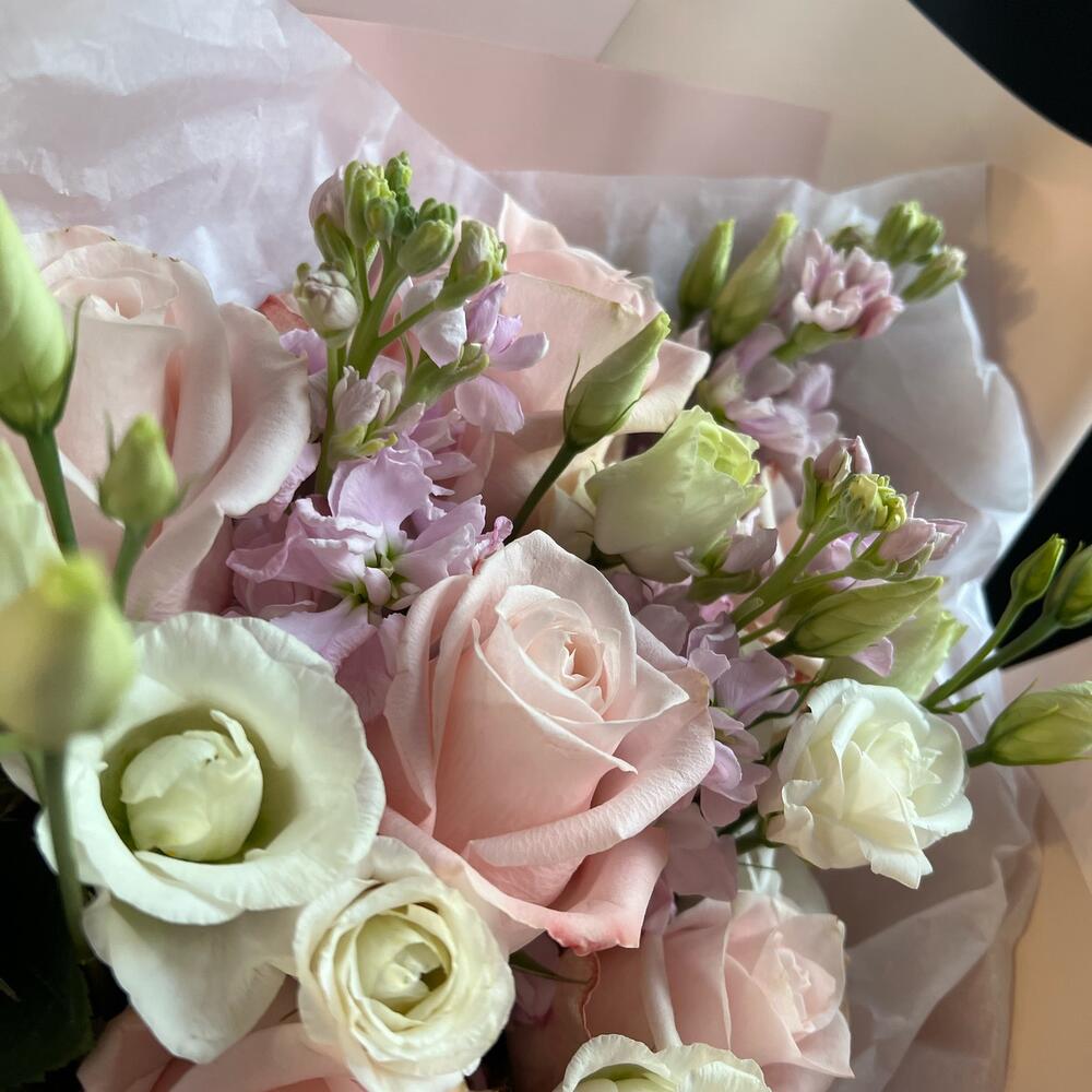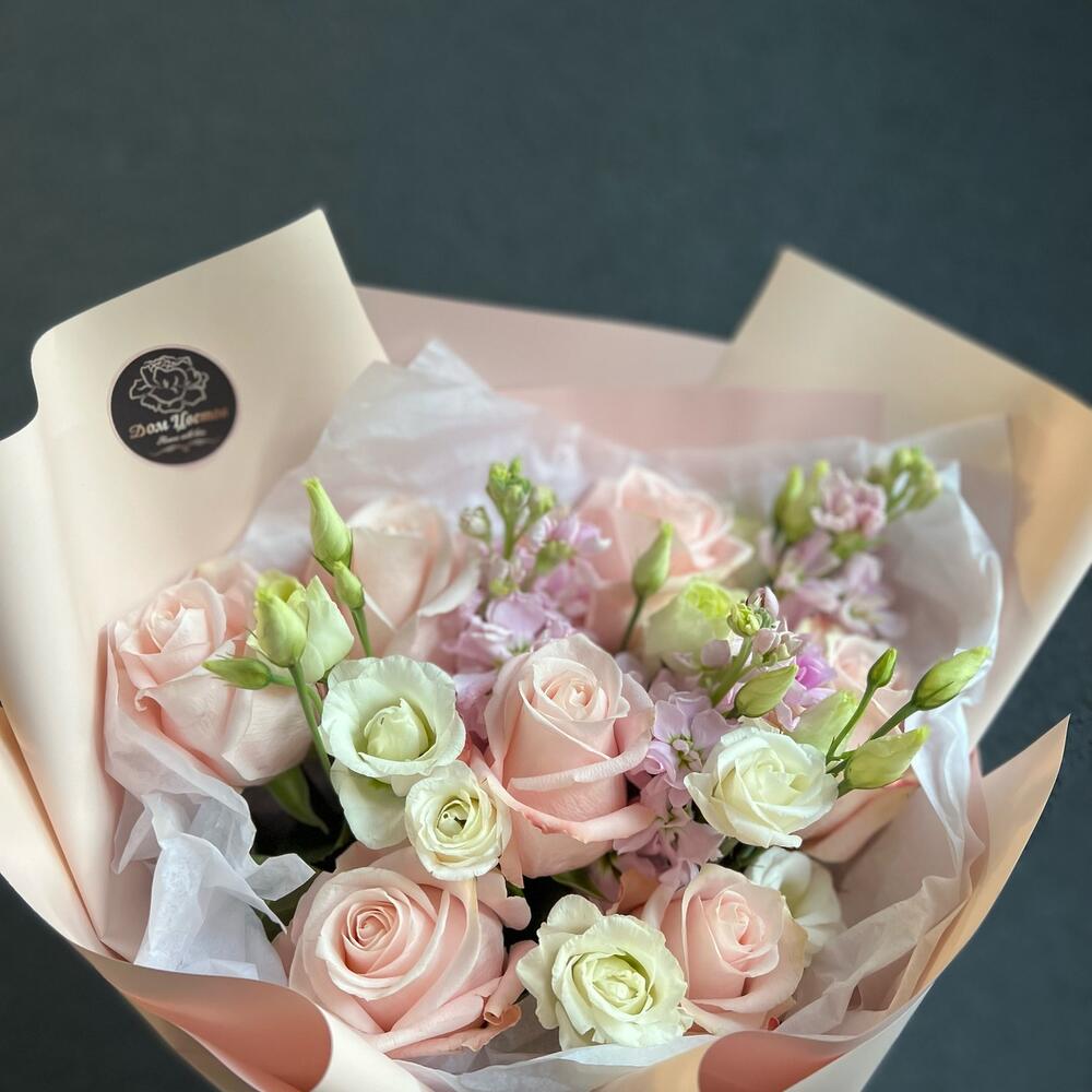 Букет из нежной розы, маттиолы и эустомы