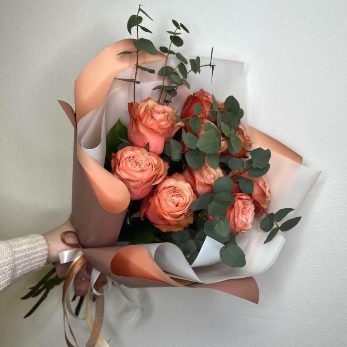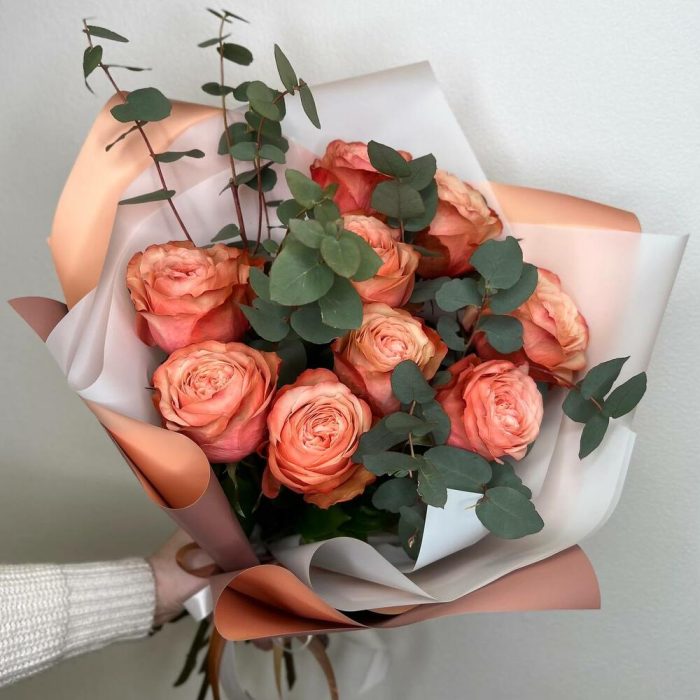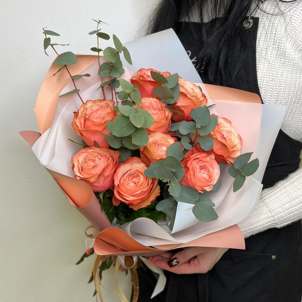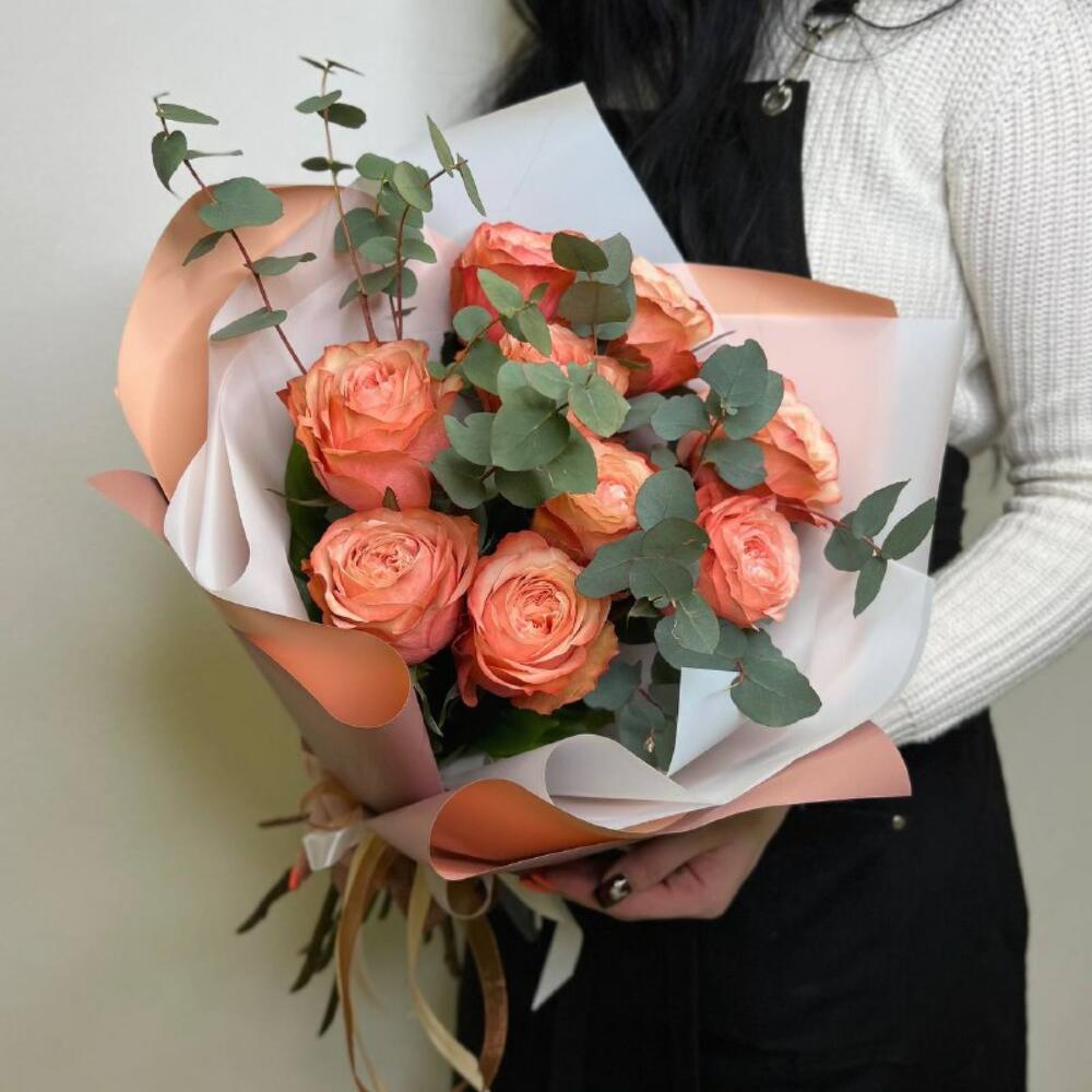 Букет из пионовидных персиковых роз и эвкалипта