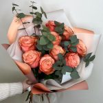 Пионовидная роза одноголовая – 9 шт.Эвкалипт – 3 шт.Рускус – 5 шт.Упаковка дизайнерская – 3 шт.