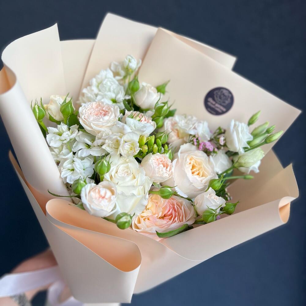 Пионовидная роза – 3 шт.Кустовая пионовидная роза – 2 шт.Маттиола – 2 шт.Фрезия белая – 2 шт.Хамелациум – 1 шт.лизтантус – 1 шт.декоративная упаковка – 1 шт.Атласная лента – 1 шт.