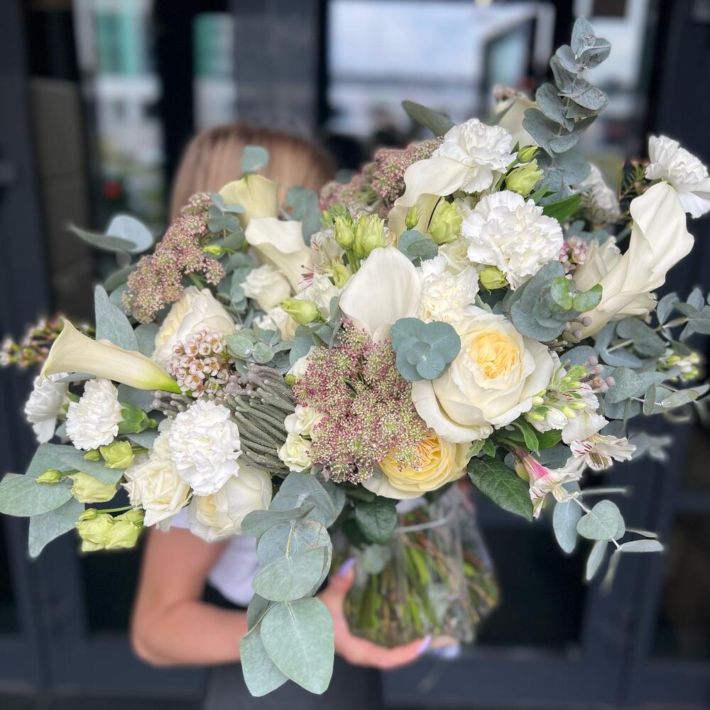 Калла – 8 шт.Роза одноголовая – 6 шт.Пионовидная роза – 7 шт.Амми – 3 шт.Лизиантус – 4 шт.Оксипеталум – 5 шт.Альстромерия – 5 шт.Гвоздика – 13 шт.Бруния – 5 шт.Хамелациум – 6 шт.Эвкалипт – 7 шт.
