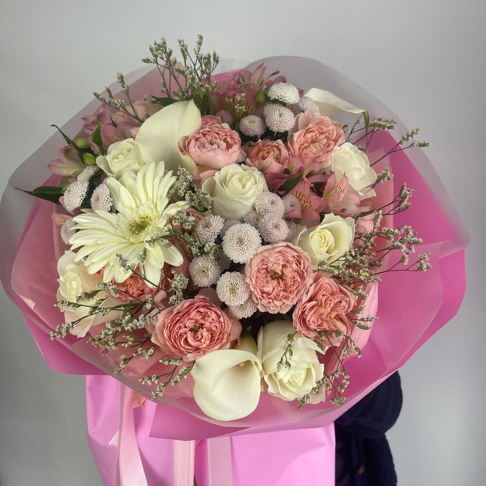 Пленка – 6 шт.каллы белые – 2 шт.Роза белая – 5 шт.джульетта роза пионовидная – 5 шт.Альстромерия – 3 шт.Сантини – 3 шт.Лимониум – 2 шт.Гербера – 1 шт.Салал пучок – 1 шт.