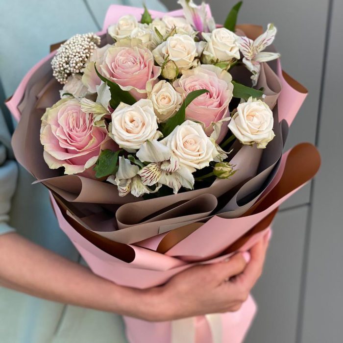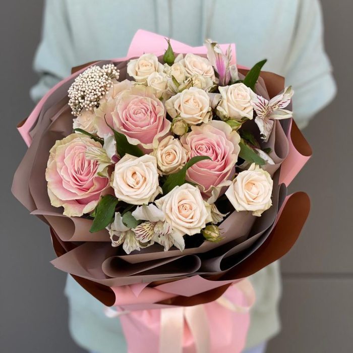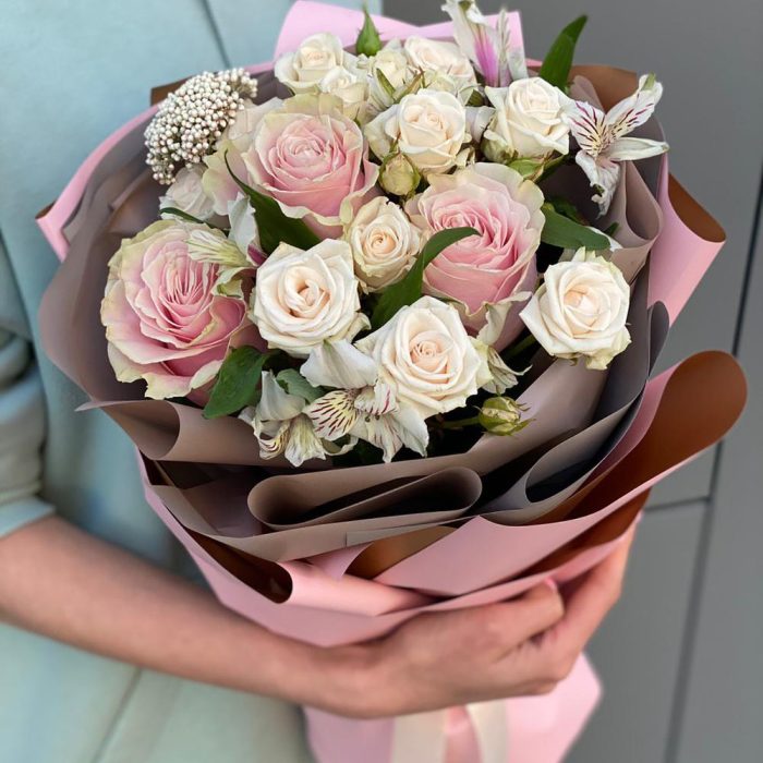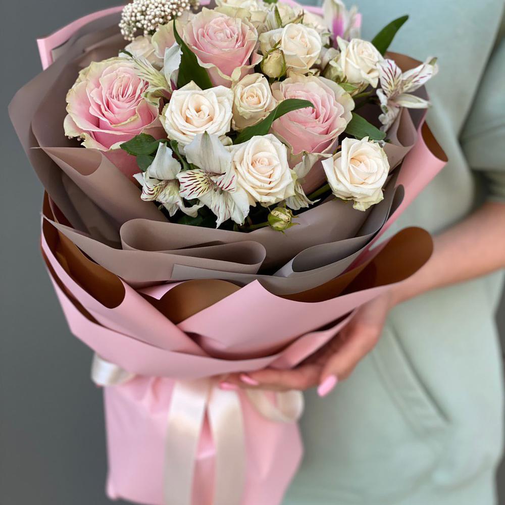 букет из кустовых и одноголовых роз, альстромерии и озотамнуса в оформлении!