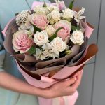 кустовая роза порцелина – 3 шт. Альстромерия – 2 шт. Роза пинк мондиаль – 3 шт. Озотамнус – 1 шт. Оформление – 1 шт.