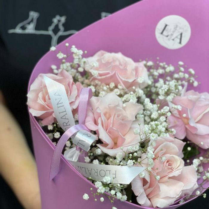Гипсофила – 4 шт.Роза Эквадор 60 см – 5 шт.лента фирменная – 2 шт.Фоамиран (упаковка) – 1 шт.