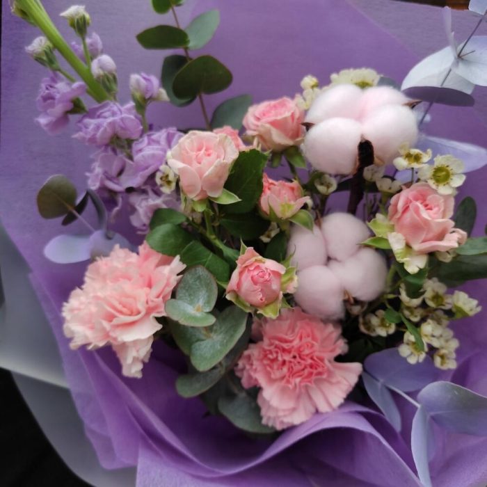 Роза кустовая – 1 шт.Диантус – 2 шт.Хлопок – 2 шт.Маттиола – 1 шт.Эвкалипт – 1 шт.Ваксфлауэр – 1 шт.Лента – 2 шт.Упаковка дизайнерская – 2 шт.