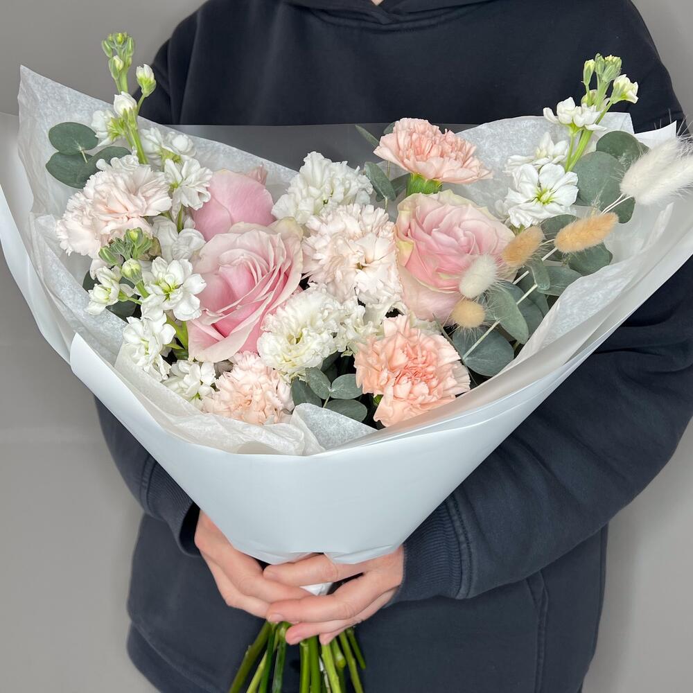 Лизиантус – 1 шт.Маттиола – 3 шт.Роза – 3 шт.Диантус – 5 шт.Упаковка дизайнерская – 1 шт.комплимент от polyanka – 1 шт.