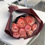 Букет из 11 кораллово-розовых пионовидных роз Wild Love с фисташкой