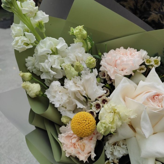 Роза – 1 шт.Лизиантус – 2 шт.Ваксфлауэр – 2 шт.Маттиола – 1 шт.Диантус – 3 шт.Папоротник – 2 шт.Лента – 2 шт.Упаковка дизайнерская – 2 шт.