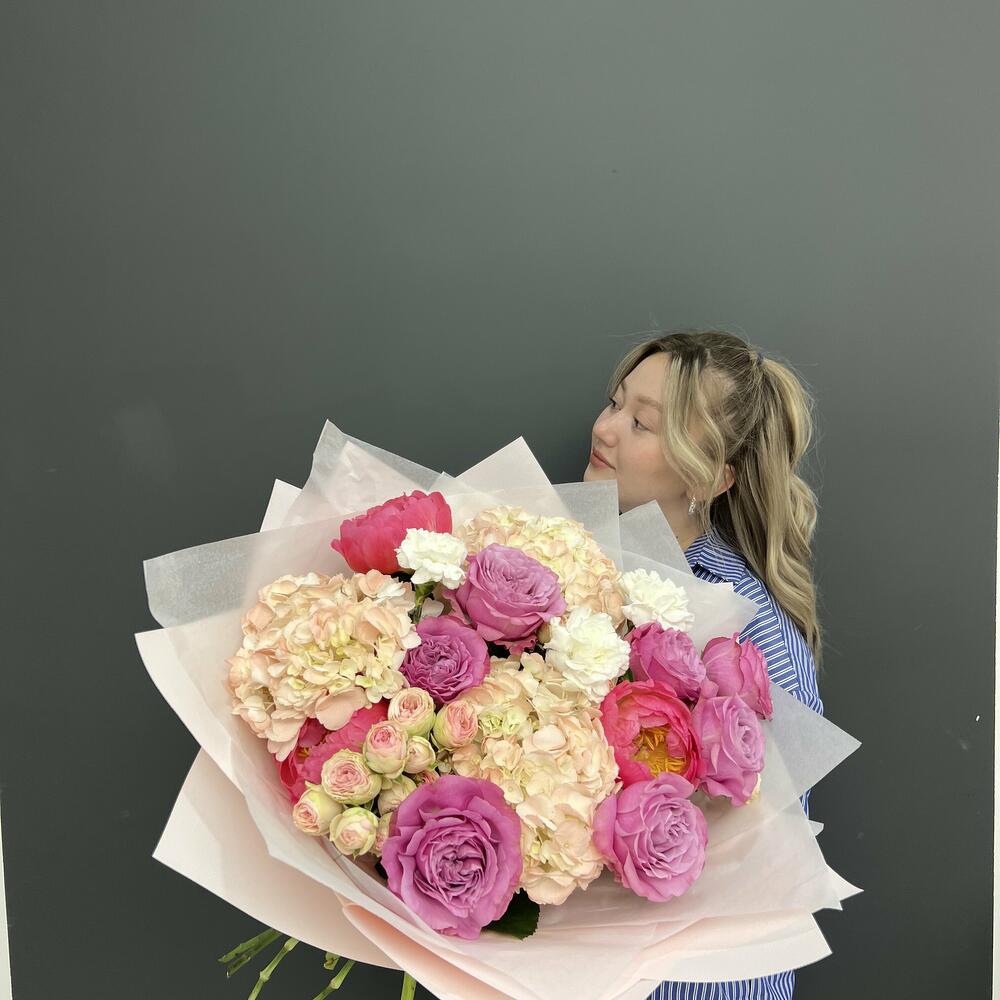 Букет с пионами ,орхидея ,Роза в дизайнерском оформлении