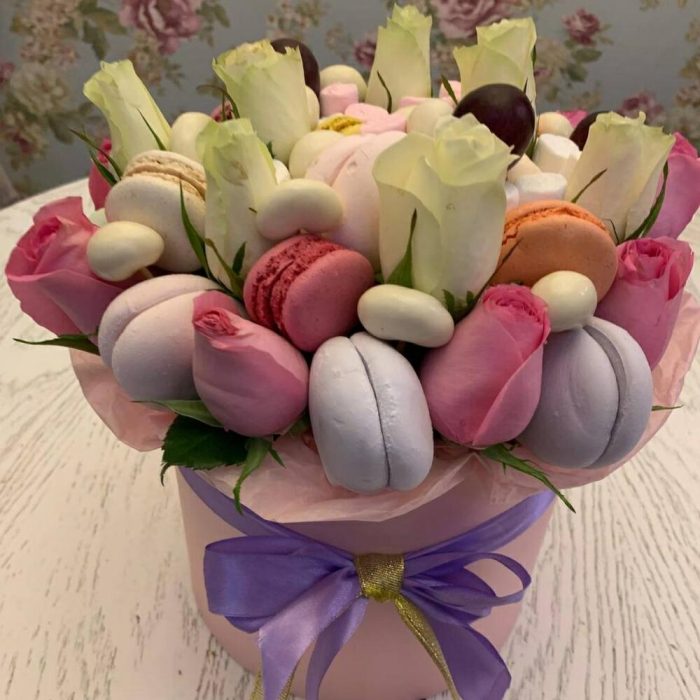 макарон (пирожное) – 6 шт.орехи в глазури – 100 гр.розы белые россия – 9 шт.розы розовые – 9 шт.зефир цветной – 200 гр.мешмеллоу – 100 гр.