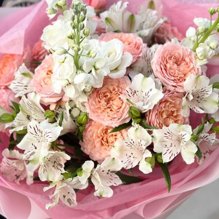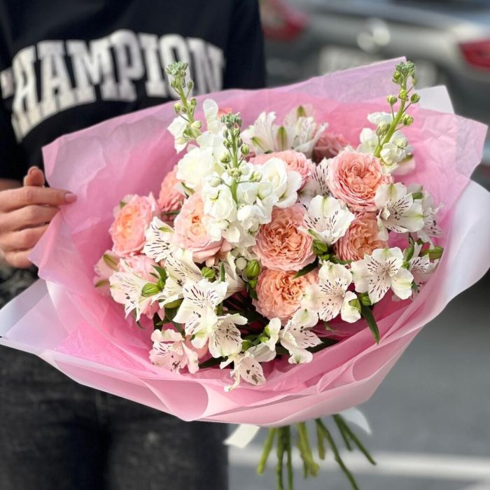 Альстромерия – 4 шт.Маттиола – 3 шт.Роза Джульетта – 3 шт.Упаковка дизайнерская – 4 шт.Лента атласная – 1 шт.