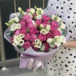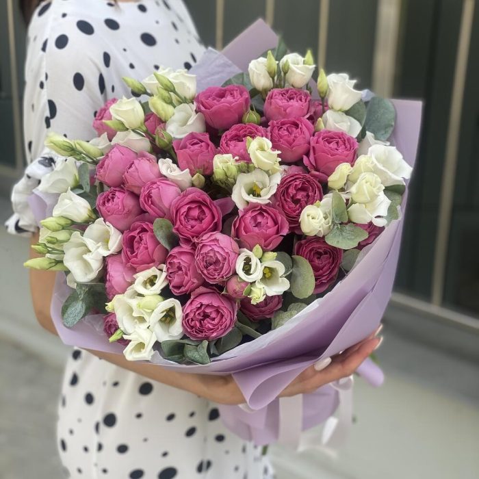 Эвкалипт – 2 шт. Оформление – 1 шт. эустома белая – 6 шт. кустовая пионовидная роза misty bubbles – 8 шт.