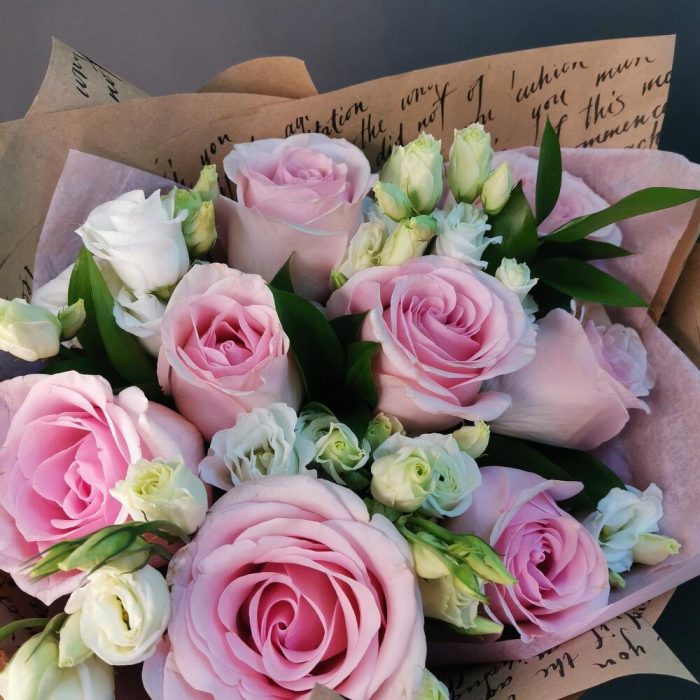 Роза Эквадор – 7 шт.Эустома – 5 шт.зелень декоративная – 5 шт.Упаковка дизайнерская – 1 шт.