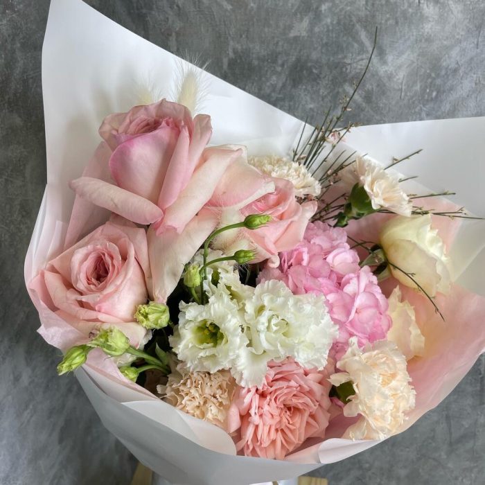 Pink O’Hara роза – 4 шт.white o’hara – 2 шт.Гвоздика – 3 шт.Гортензия – 1 шт.Лизиантус – 2 шт.Лагурус – 5 шт.Гениста – 3 шт.Упаковка дизайнерская – 1 шт.Лента атласная – 2 шт.