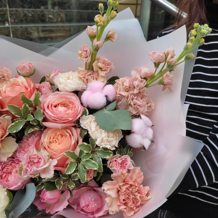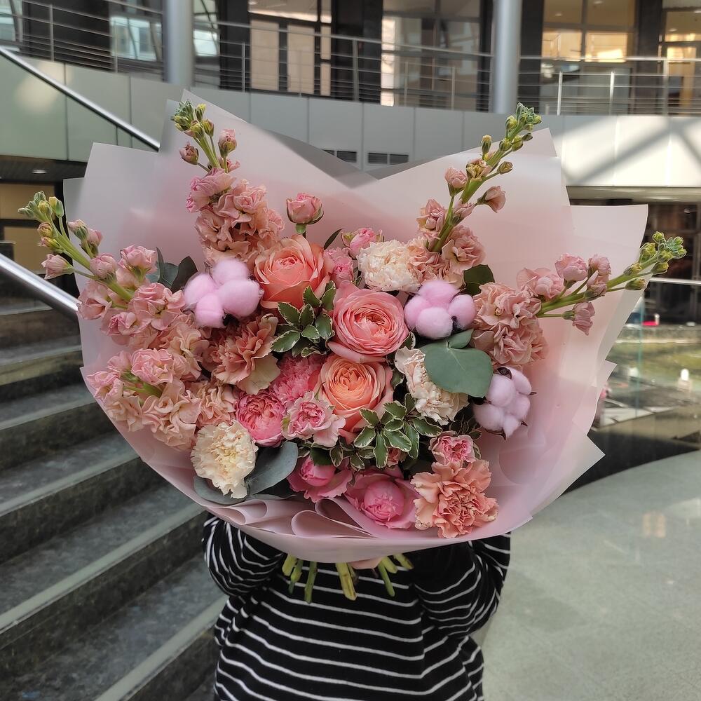 Маттиола – 5 шт.Роза – 3 шт.Роза кустовая – 1 шт.Роза кустовая пионовидная – 1 шт.Диантус – 6 шт.Эвкалипт – 1 шт.Питтоспорум – 1 шт.Хлопок – 3 шт.Упаковка дизайнерская – 2 шт.Лента атласная – 2 шт.