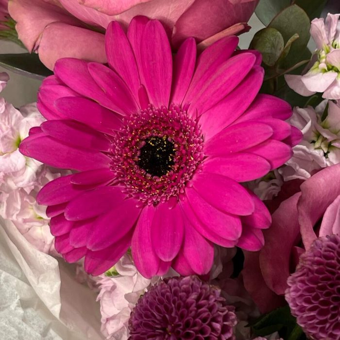 Букет с розами и яркими герберами “Малиновый Гоголь-моголь”