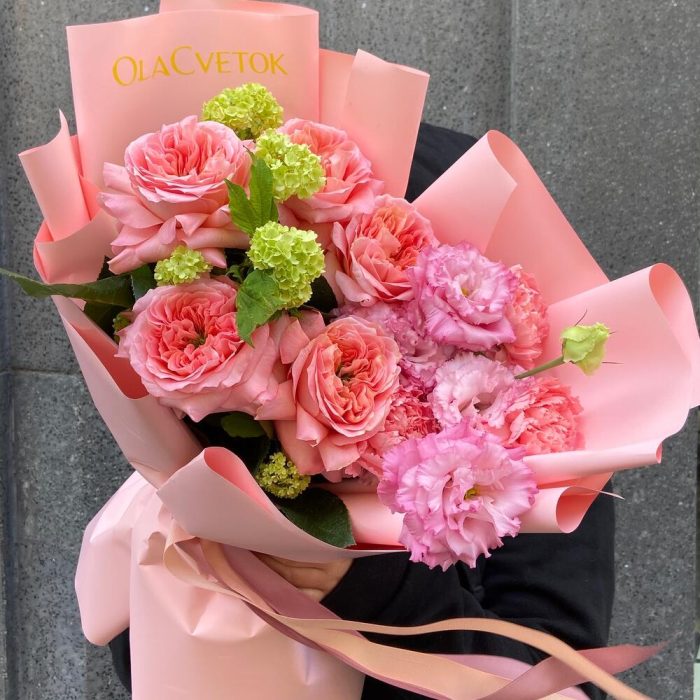 Вибурнум – 2 шт.Эустома – 2 шт.Лента атласная – 1 шт.Диантус – 3 шт.Упаковка дизайнерская – 1 шт.роза мандарин экспрешен – 5 шт.