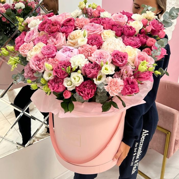 Роза пионовидная – 39 шт.Лизиантус – 12 шт.Пион – 4 шт.Диантус – 9 шт.Кустовая роза – 12 шт.Эвкалипт – 5 шт.Шляпная коробка – 1 шт.