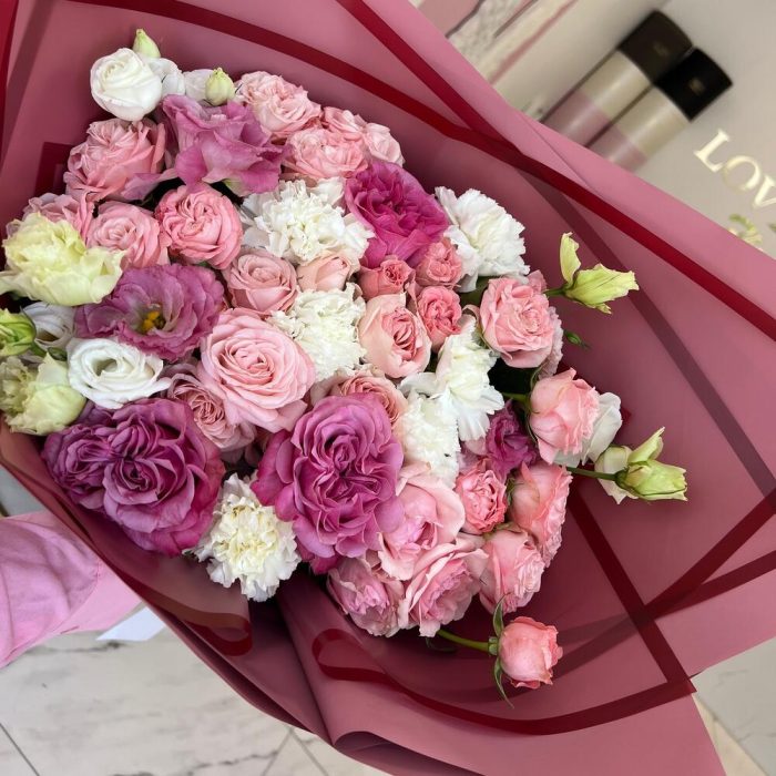 Пионовидная роза – 3 шт.Кустовая роза – 7 шт.Диантус – 5 шт.Эустома – 4 шт.Авторская упаковка – 5 шт.