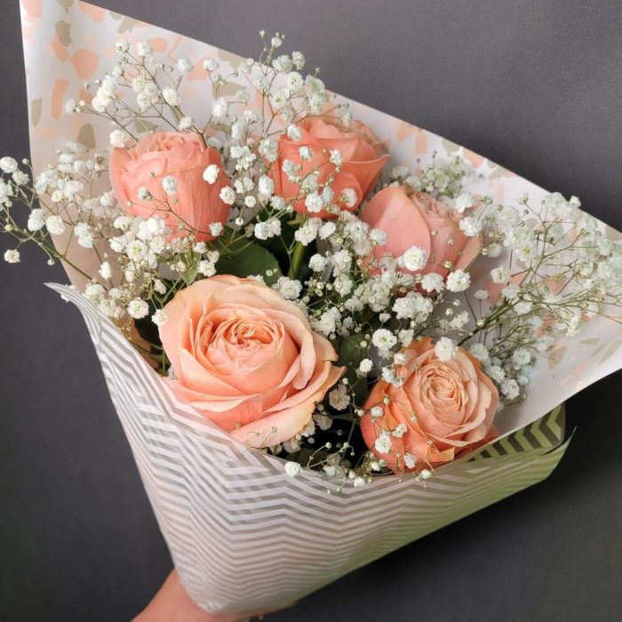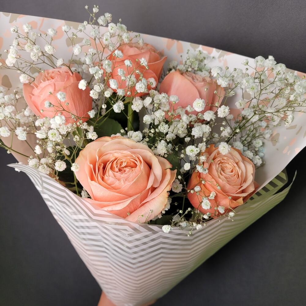 Роза Эквадор – 5 шт.Гипсофила – 2 шт.Упаковка дизайнерская – 1 шт.Лента атласная – 1 шт.