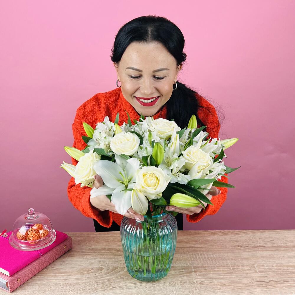 лилия (белый) – 2 шт.альстромерия (белый) – 3 шт.роза одноголовая (белый) – 5 шт.Ваза – 1 шт.