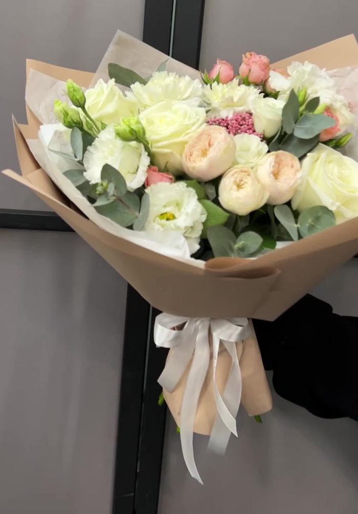 роза пионовидная плайа бланка – 3 шт.Роза кустовая пионовидная – 1 шт.роза кустовая мадам бомбастик – 1 шт.Озотамнус – 1 шт.Диантус – 2 шт.эустома махровая белая – 1 шт.эустома розита вайт – 1 шт.Эвкалипт – 2 шт.Тишью – 2 шт.Пленка матовая – 4 шт.Лента атласная – 2 шт.