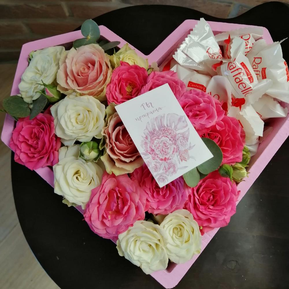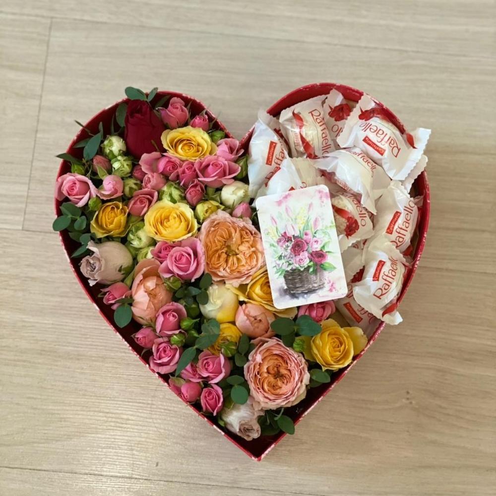 Коробка сердце – 1 шт.Флористическая губка – 1 шт.Роза одноголовая – 3 шт.Роза кустовая – 5 шт.Эвкалипт – 1 шт.Карточка для подписи – 1 шт.рафаело конфеты – 15 шт.