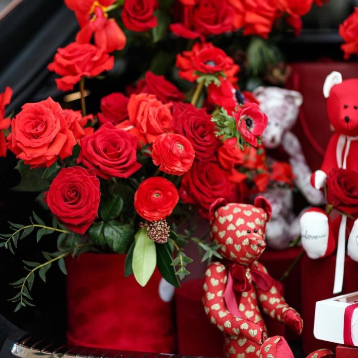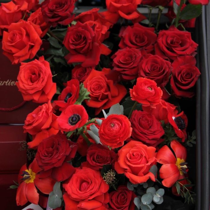 Коробка шляпная большая – 3 шт.коробка круглая бархатная – 3 шт.гирлянда «i love you” – 1 шт.Роза – 65 шт.Тюльпан – 15 шт.Ранункулюс – 10 шт.Эвкалипт Микс – 10 шт.Анемон – 10 шт.Зелень – 10 шт.премиальный медведь тедди – 2 шт.набор макарон 10 шт – 1 шт.
