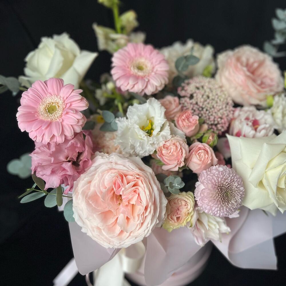 Цветы в коробке из пионовидныз роз, хризантем и Гербер