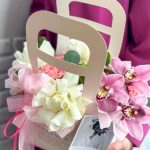 Орхидея Цимбидиум – 3 шт.Эвкалипт – 1 шт.Открыточка с вашими пожеланиями – 1 шт.Оазис флористический – 1 шт.Сумочка с ручками из плотного картона ламинированого – 1 шт.Диантус сортовой – 5 шт.роза плая бланка – 3 шт.