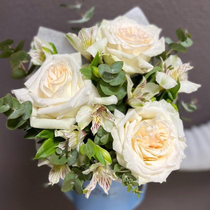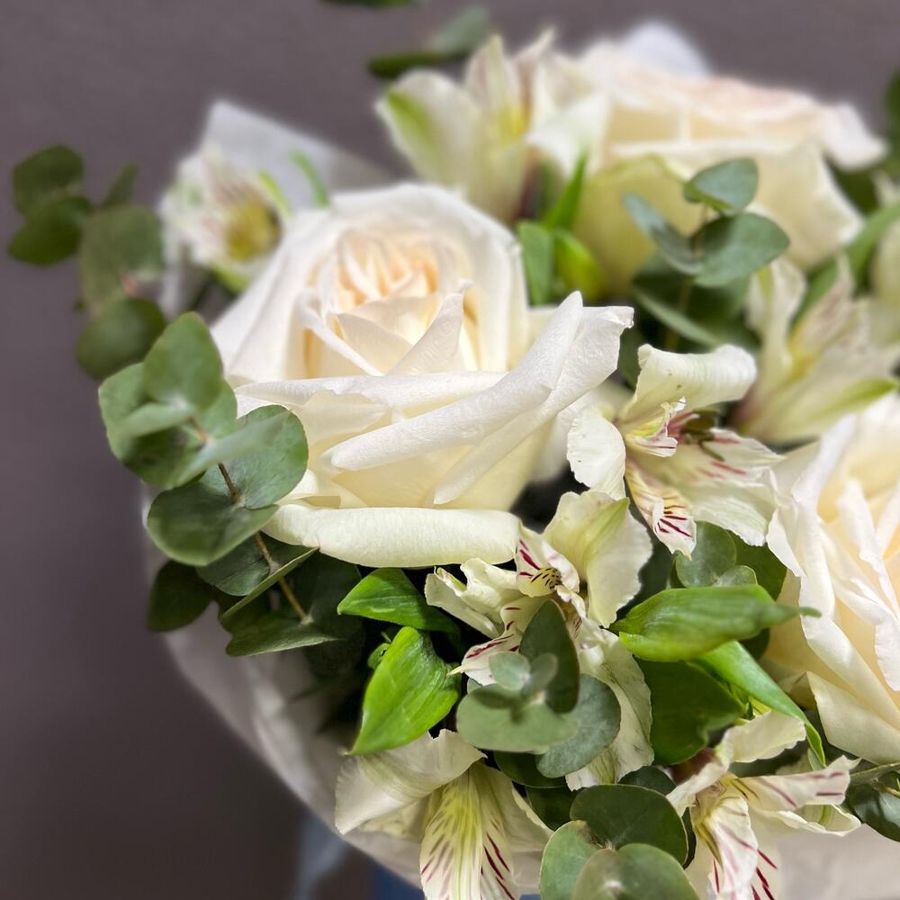 Альстромерии, Гвоздики, Кустовые розы, Лизиантусы, Розы, Хризантемы