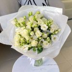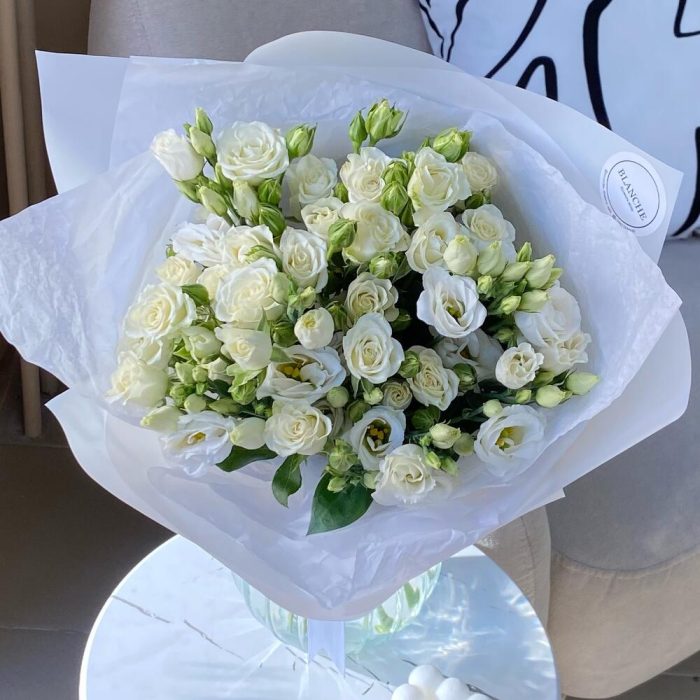 Лизиантус – 5 шт.Кустовая роза белая – 5 шт.Фирменная упаковка – 1 шт.