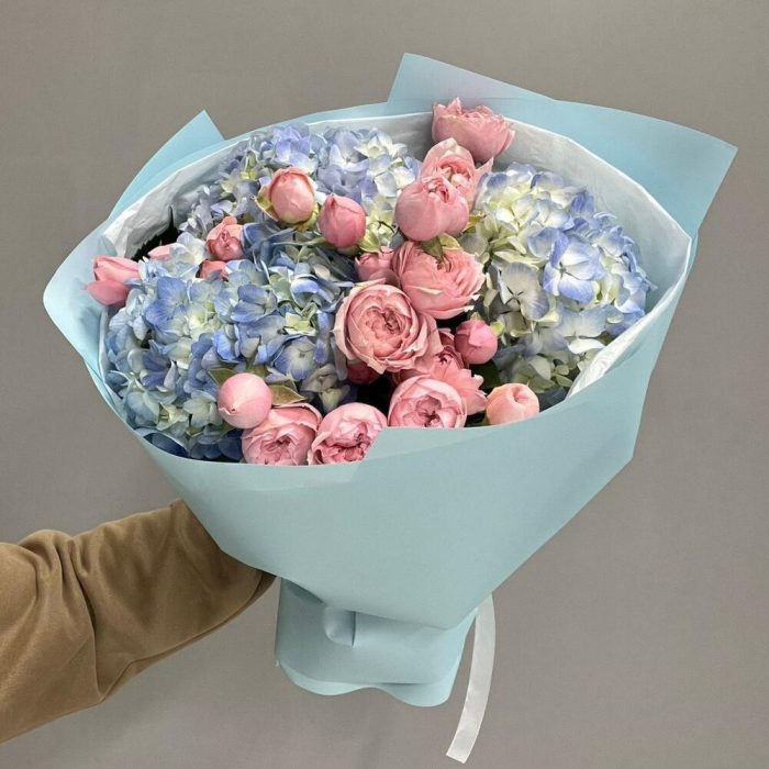 Авторский букет из голубой Гортензии, пионовидных Роз и Хризантемы Момоко