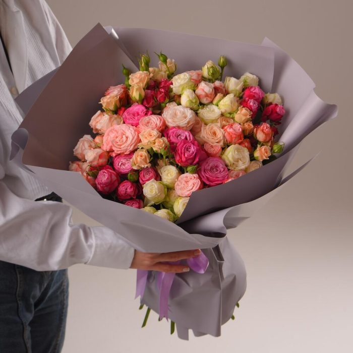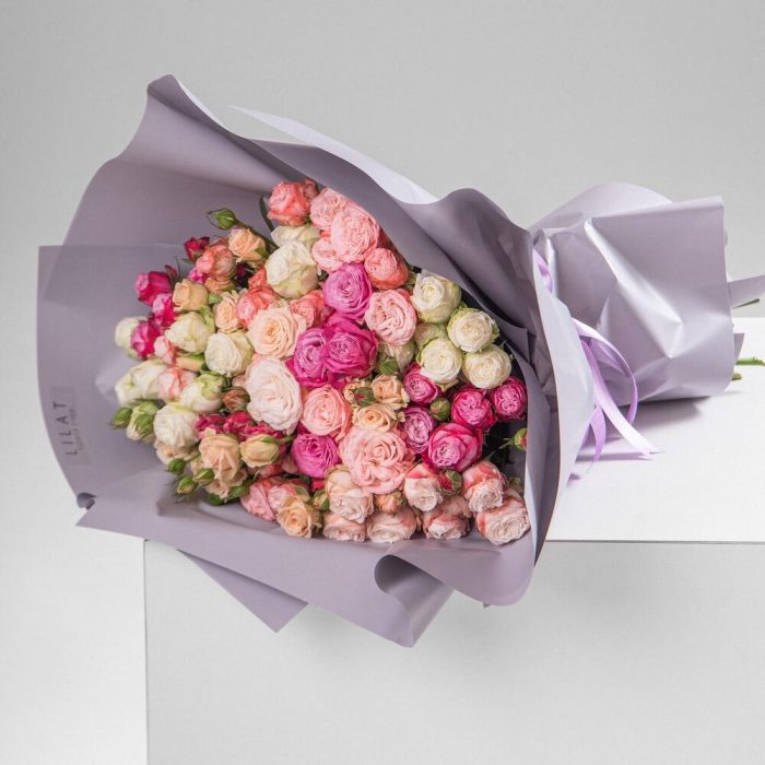 Упаковка дизайнерская – 3 шт. Открыточка с вашими пожеланиями – 1 шт. кустовые пионовидные розы – 51 шт.