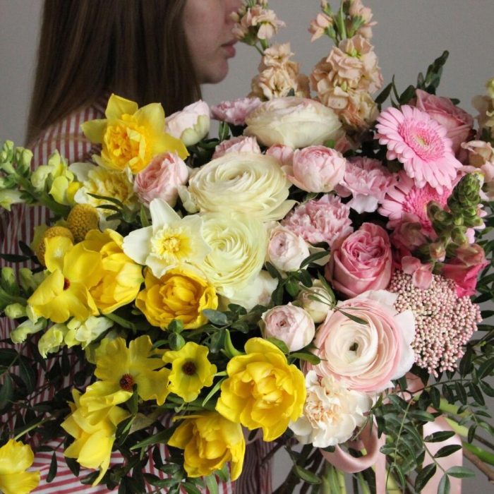 Клубнично-банановый, весенний букет с тюльпанами, нарциссами и ранункулюсами