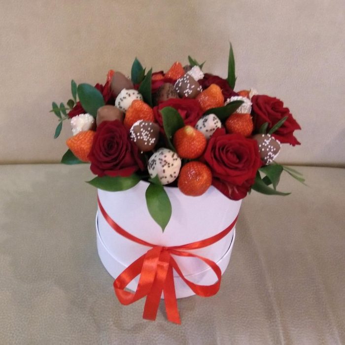 клубника в шоколада – 15 шт.Клубника (шт) – 10 шт.Роза красная 50 см – 9 шт.Коробка шляпная – 1 шт.Зелень – 1 шт.
