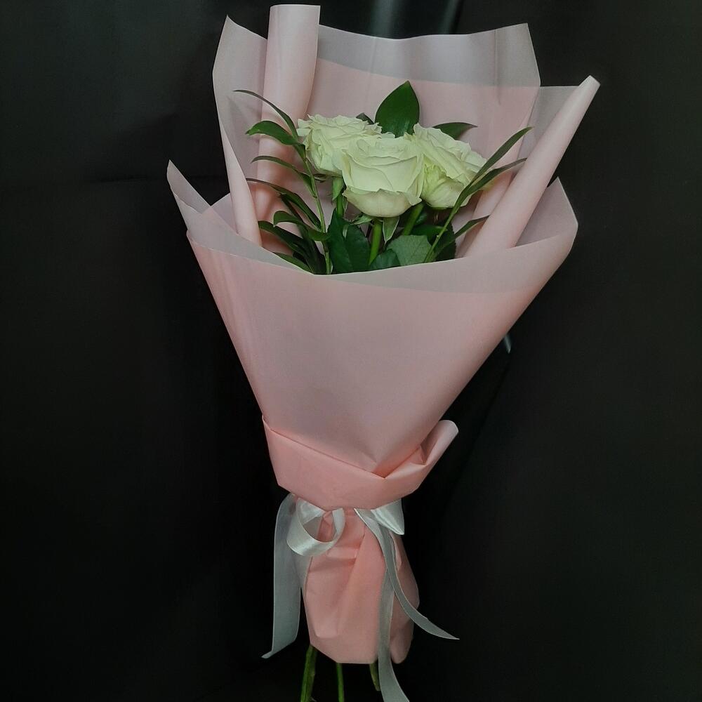 белые розы 50 см – 3 шт.Корейская пленка – 1 шт.Рускус сочи – 3 шт.Лента атласная – 1 шт.