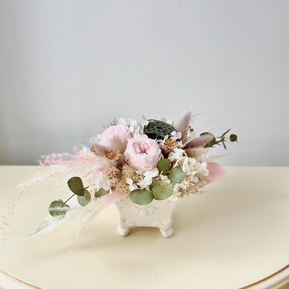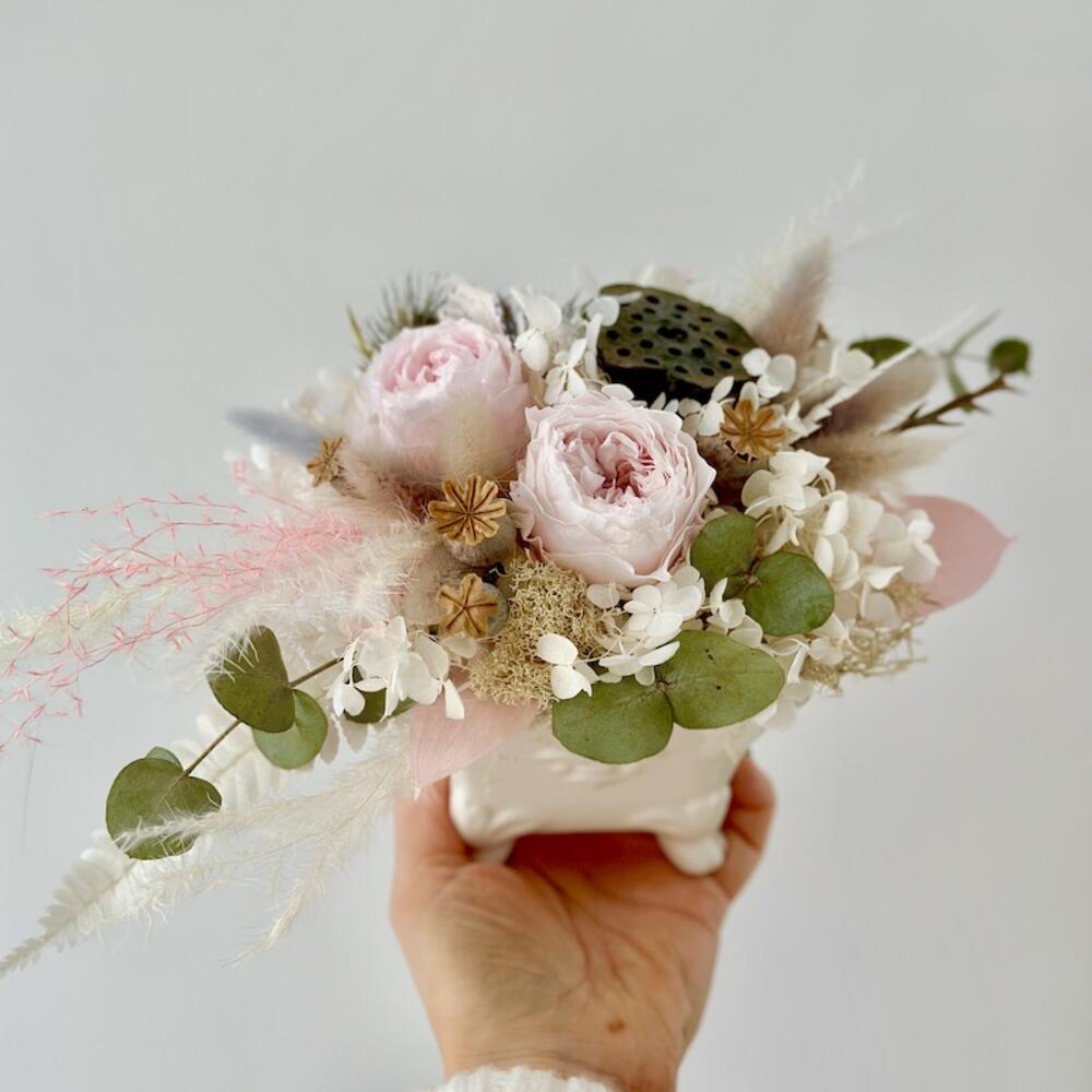роза стабелизированная – 2 шт.Лотос – 1 шт.Мак – 3 шт.гортензия стабелизированная – 1 шт.Лагурус – 3 шт.Злак – 5 шт.сухоцветы микс – 5 шт.Кашпо керамика – 1 шт.Оазис для сухоцветов – 1 шт.Мох – 1 шт.зелень микс – 3 шт.