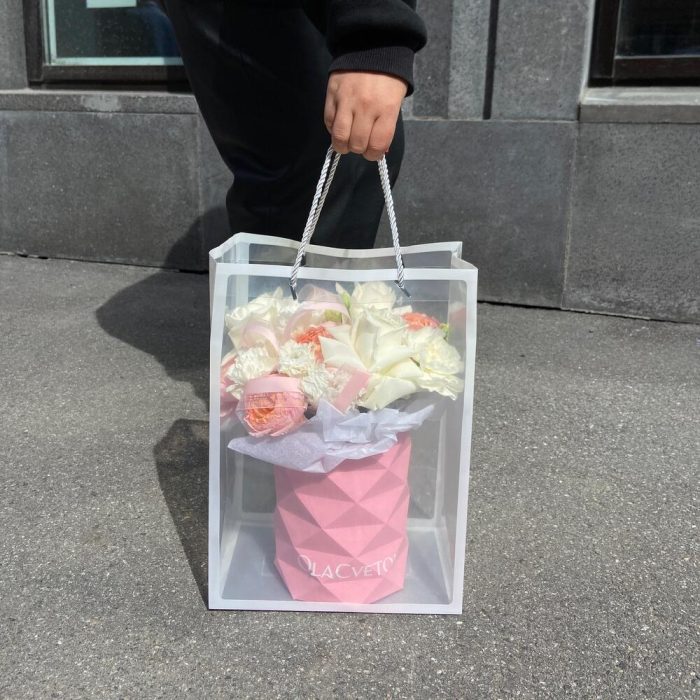 плая бланка – 3 шт.Лизиантус – 2 шт.Диантус – 3 шт.джульетта роза пионовидная – 1 шт.Коробка шляпная – 1 шт.Тишью – 2 шт.Лента атласная – 1 шт.пакет прозрачный для цветов – 1 шт.