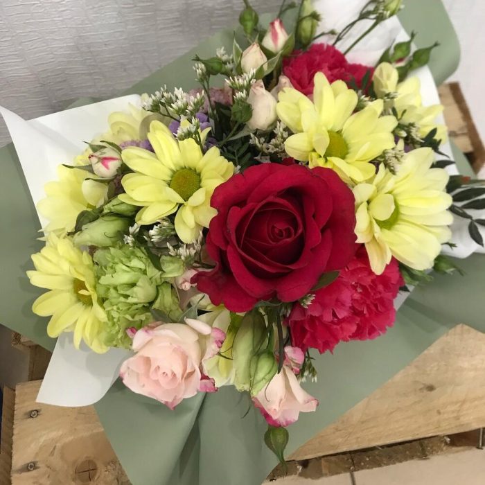 Хризантема кустовая – 1 шт.Хризантема Сантини – 1 шт.Фисташка – 2 шт.Упаковка дизайнерская – 1 шт.Оазис флористический – 1 шт.Лизиантус алиса пинк – 1 шт.роза кустовая кения 60 см – 2 шт.гвоздика стандарт – 3 шт.гвоздика moon – 2 шт.роза хот эксплорер 60 см – 1 шт.