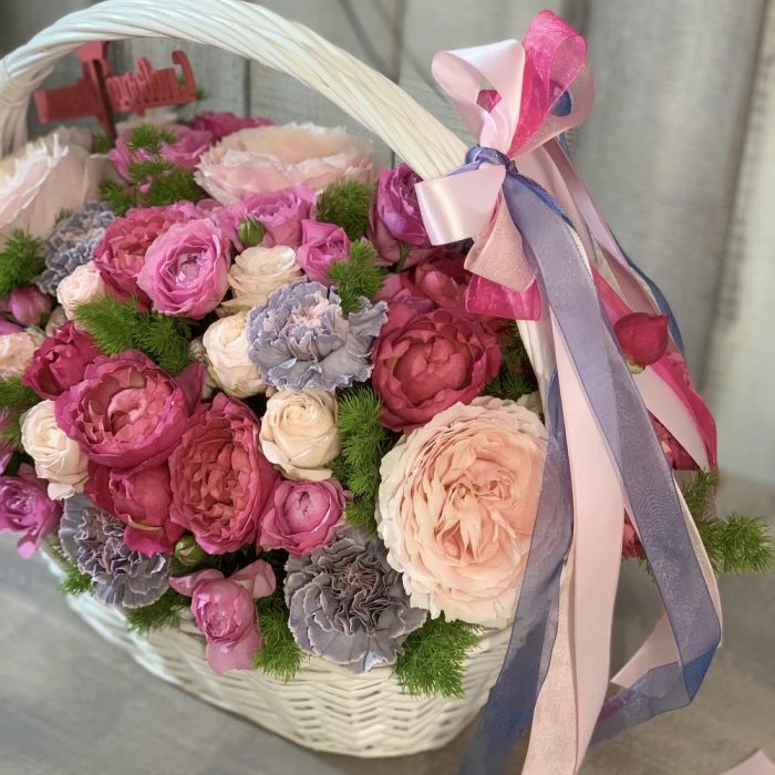 Роза пионовидная – 7 шт.роза пионовидная кустовая «джульетта сериз» – 3 шт.роза пионовидная кустовая «джульетта принцесса» – 5 шт.роза кустовая пионовидная «бомбастик» – 5 шт.Диантус сортовой – 11 шт.Аспарагус – 3 шт.Оазис флористический – 2 шт.Корзина плетеная – 1 шт.Лента – 7 шт.